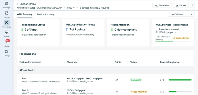 - Checks compliance in real time: Your IAQ data is automatically compared to WELL thresholds for relevant features.