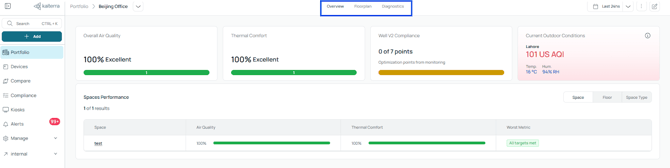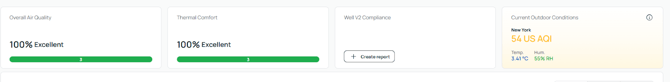 At the top, you’ll see a summary of the building, including Air Quality, Thermal Comfort, and WELL V2 status. These are shown as percentages.