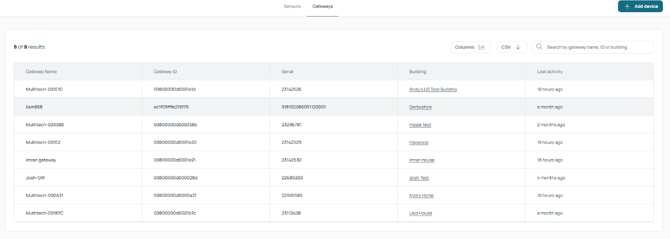 You can switch to the Gateway view, which shows all gateways in your organization, including their name, ID, serial number, assigned buildings, and last activity.