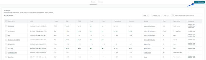 Each device includes its readings for air quality and thermal metrics, along with its assigned building, floor, and space. You’ll also see details such as Module Life and connection status.