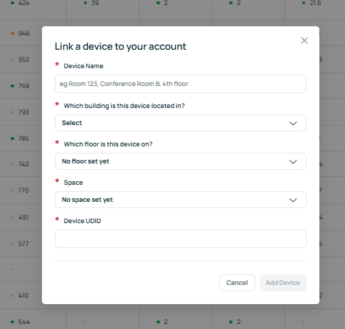 In this window, you will enter a Device Name, select the Building, Floor, and Space where the sensor is located from dropdown menus, and provide the Device UDID.