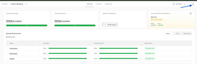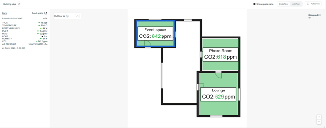 Clicking on any space will open a detailed view showing metrics like CO₂, PM2.5, TVOC, temperature, and humidity..