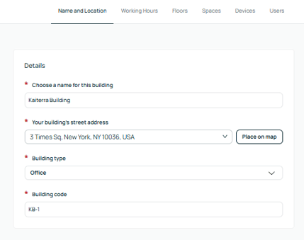 This is where you define the number of floors, which will later be used when uploading floor plans and assigning spaces.