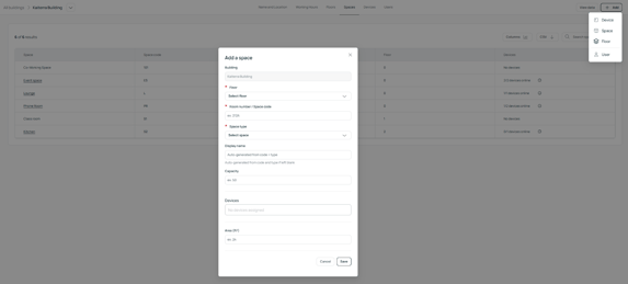 Spaces represent areas such as meeting rooms, offices, or zones within your building.