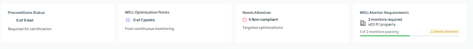 Use this page to check your building’s compliance status and understand how it performs against WELL V2 requirements.