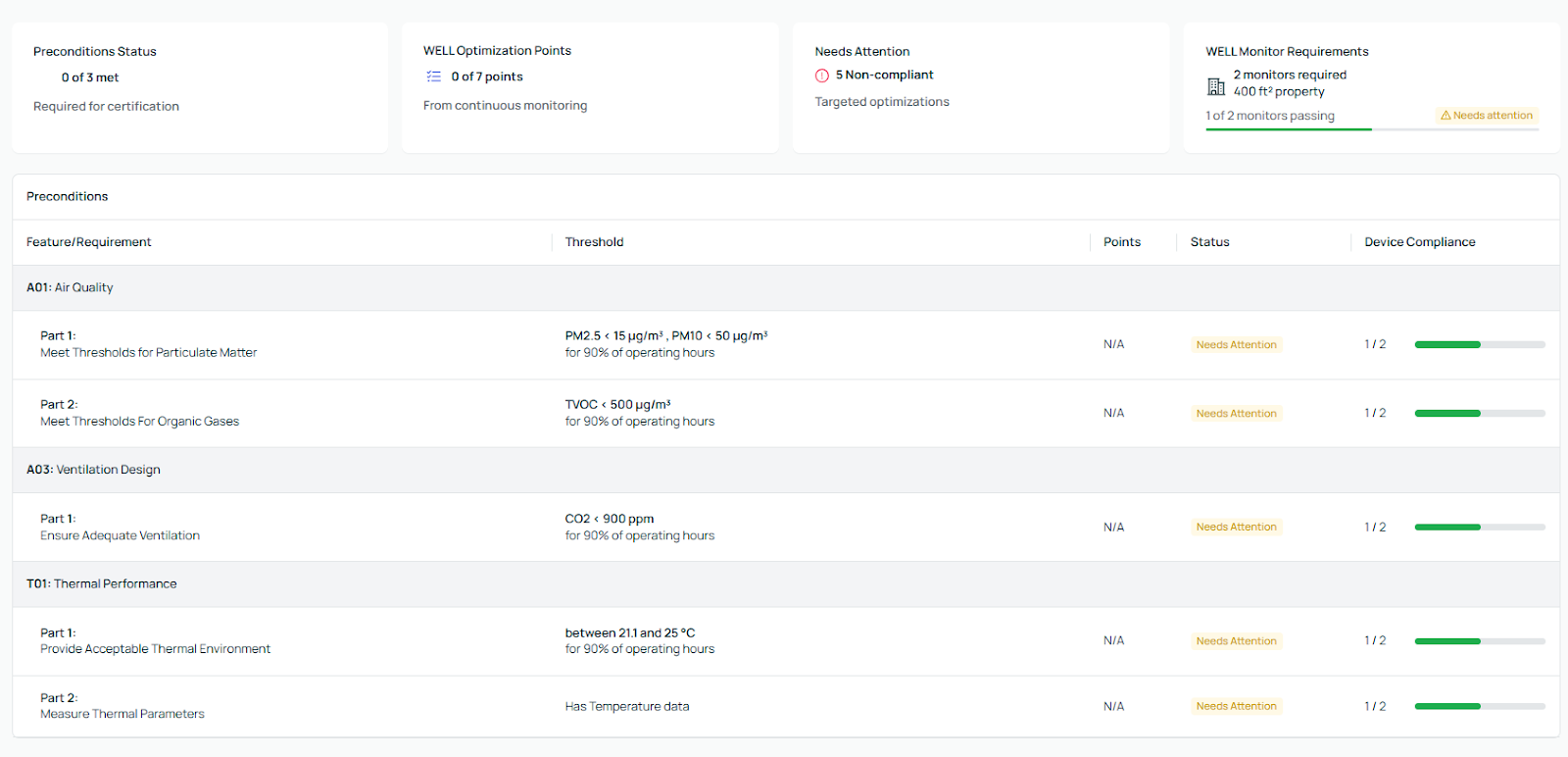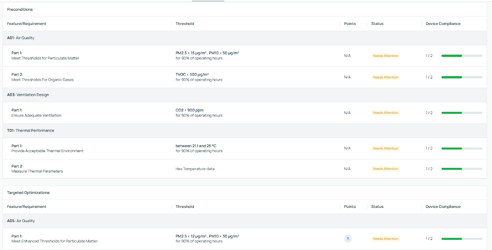 The Compliance section contains reporting tools that evaluate your building’s performance against recognized healthy building standards. It helps you understand how your building aligns with certification requirements and identify areas for improvement.