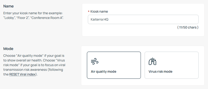 The Kiosks includes different modes, such as Air Quality view and Virus Risk view, which change how the data is interpreted and displayed.